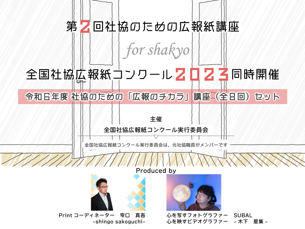 令和7年度社協のための「広報のチカラ」講座(全8回) 開催予定日・内容 いずれも13:30~15:30 第1回 「伝わる」ための広報講座(新任広報担当者に聞いて欲しい内容) 2025年4月24日(木) 第2回 受賞広報紙から学ぶレイアウト講座 2025年5月28日(水) 講師 株式会社エスフェクト代表取締役社長 窄口真吾 第3回 受賞広報紙から学ぶ写真講座 2025年6月25日(水) 講師 心を写すフォトグラファー SUBAL 第4回 広報×○○講座 2025年7月予定 第5回 ホームページ・SNS活用講座 2025年8月予定 第6回 最優秀賞社協から学ぶ広報紙講座 2025年9月予定 第7回 優秀賞社協から学ぶ広報紙講座 2025年10月予定 第8回 TTPT講座(質疑応答中心) 2025年11月予定 ※開催時期・時間は予定です。また、テーマは前後する可能性があります。グループワークも行います。 実施方法 zoomによるオンライン開催